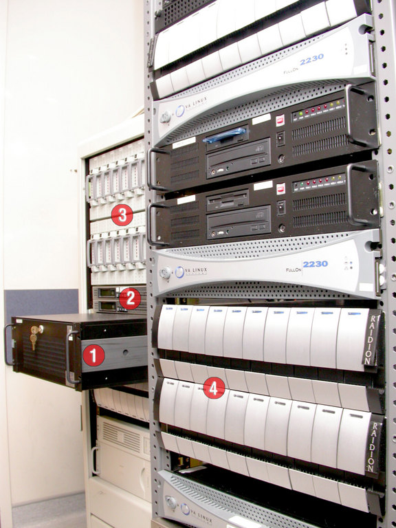 Figure 2. First-generation server hardware: 1) VA Linux VAR900 2xXeon-500 exporting 1TB, 2) Raidion.u2w RAID controllers, 3) 2x8x36GB SCSI disks and 4) VA Linux 2230s and 3x10x72GB SCSI disks.