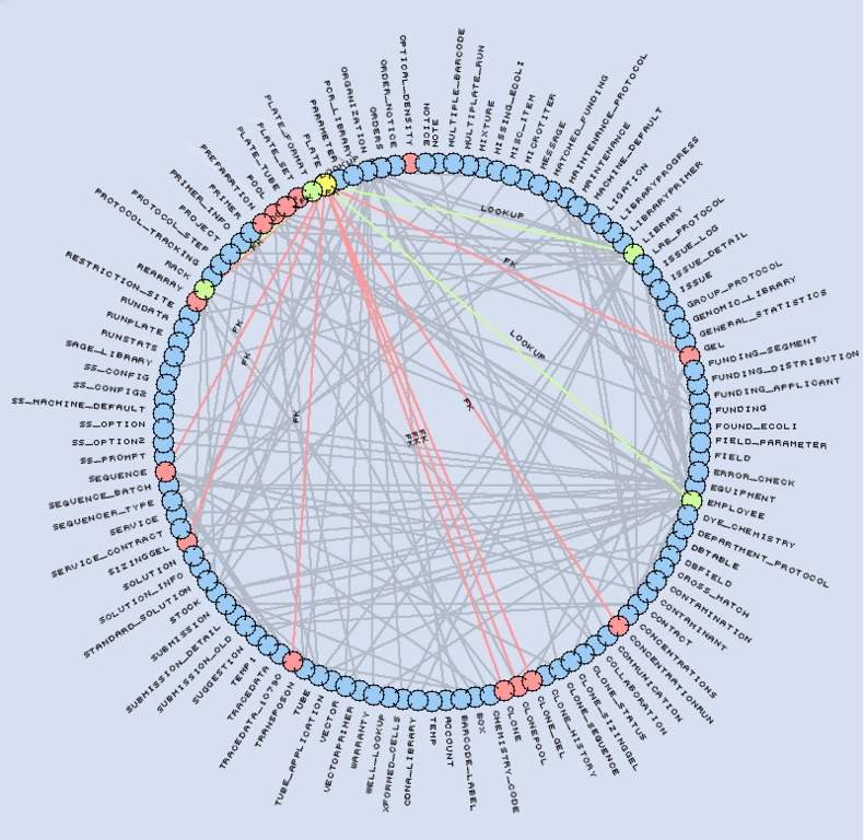 The MySQL Laboratory Information Management System (LIMS) database is central to our sequencing process. Its schema contains 115 tables, 1,171 fields and 195 foreign keys. The database tracks all reagents, equipment, processes and reactions performed in the lab. We circumvent MySQL's lack for native foreign key support by using application logic and a specific field naming convention. Foreign keys are named FKTYPE_TABLE__FIELD, indicating that they point to TABLE_FIELD in the table TABLE. The optional TYPE part of the foreign key name is used to support multiple keys to the same TABLE_FIELD.