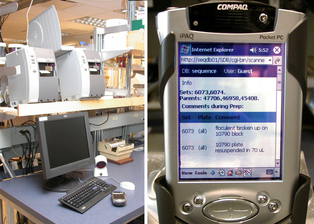Figure 4. Barcodes are printed using networked Zebra printers (left). iPAQs provide a mobile interface into the LIMS (right).