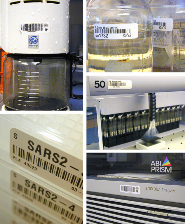 In the fall of 1999, we received our first DNA sequencer, the MegaBACE 1000 (Figure 6). A sequencer determines the specific base sequence of a DNA sample, though technology currently is limited to determining only 500–800 bases accurately at a time. This read length is much shorter than the size of even the smallest genomes (Tor2/SARS is 30,000 bases in size). Consequently, sequencers simultaneously process 96 samples at a time, and some can be loaded with multiple 96- or 384-well plates.