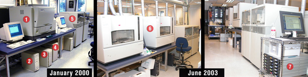 Three generations of sequencers have passed through our lab since the MegaBACE 1000, and we currently operate six ABI 3700s and three ABI 3730XLs (Figure 6). The latest, the ABI 3730XL, is capable of accepting multiple 384-well plates and sequencing 1,152 DNA samples in 24 hours. With each sample yielding up to 700–800 high-quality bases, a single 3730XL produces about 800,000 bases per day.