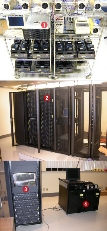 Figure 7. Computing and storage infrastructure: 1) initial deployment of x330 in January 2001, 2) 84 x330 nodes and 3) NetApp FAS960 filer and two IBM 3583 LTO libraries with two drives and 72 slots each controlled by Veritas running on an x342.