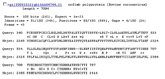 The first set of Tor2/SARS sequence data was available for our informatics group to analyze on Friday evening, April 11, 2003. To verify our sequence reactions, we checked it for contamination. A BLAST search allowed us to determine the closest match in the public proteomic and genomic databases. To our relief, the best match was to bovine coronavirus (Figure 8), indicating that we were sequencing something related to coronaviruses. The sequences of these viruses end in a string of As, and when we saw sequence reads ending in a poly-A tail we were confident that this was one end of the genome.