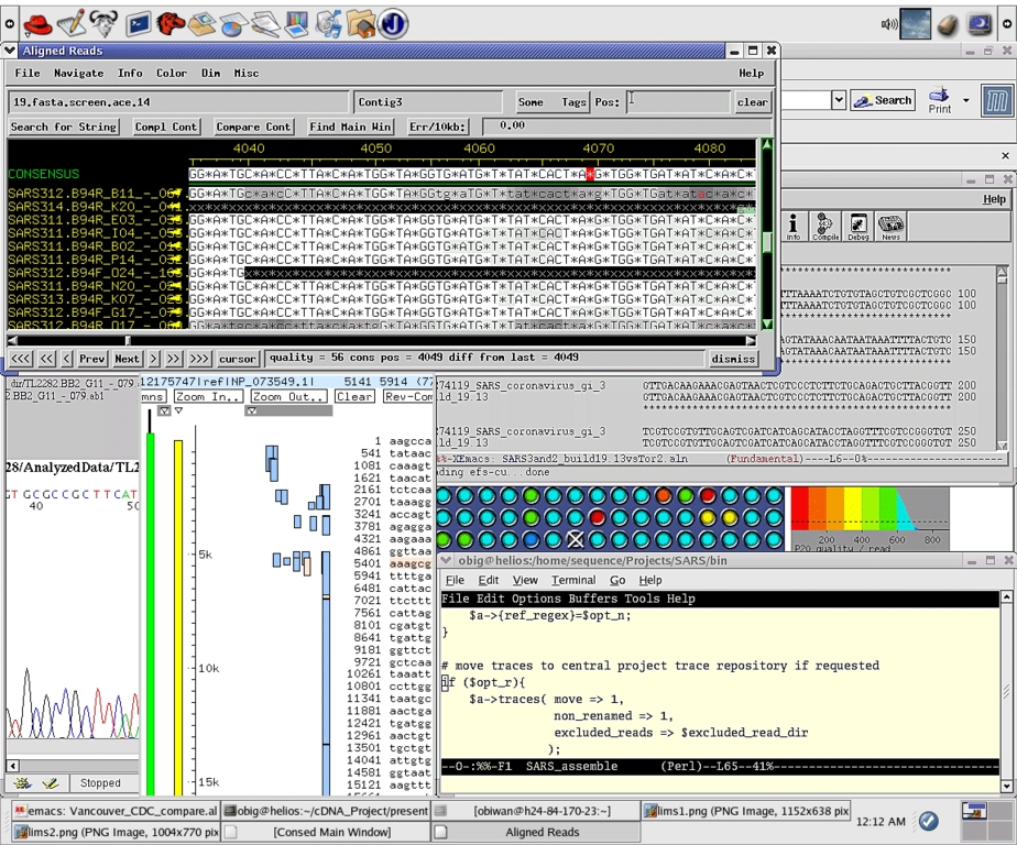 The sequence of Tor2/SARS has identified a fourth novel group of coronaviruses and provides the necessary information to develop diagnostic tests and, possibly, therapies including a vaccine. Linux has made it possible to get our work done without spending a fortune on hardware or software. Using commodity hardware has minimized depreciation loss due to long implementation times. We'll be watching for new bugs to catch, and in the meanwhile, our MySQL database is open for sequencing.