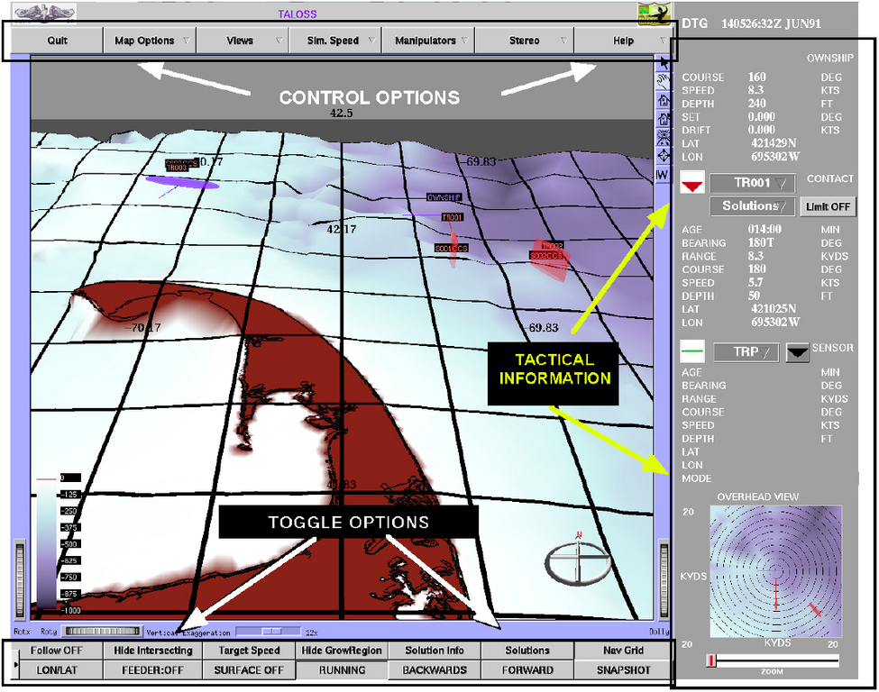 In Figure 2, observe the pull-down menus at the top of the Bezel. They allow the user access to basic TALOSS functions, such as exiting the program, changing the view, changing the map color, changing the depth regime limits and so forth. Similarly, located on the bottom of the Bezel are two rows of toggle buttons that allow for the control of the tactical information presented on the 3-D display of the undersea battlespace.