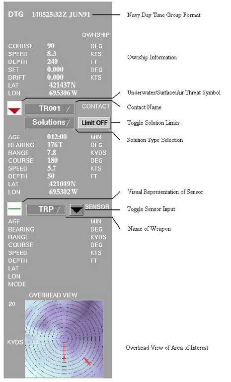 The right side of the Bezel is distinct from the top and bottom in that its purpose is to provide pertinent tactical information, such as: 1) ownship, target and weapon information; 2) target and sensor selection status; and 3) numeric target containment region information. In addition, because the entire system is synchronized to a common operational clock, whose time is given in the Navy daytime group (DTG) format, that too is displayed on the top-right side of the Bezel. Figure 3 shows a representative illustration of the right side of the Bezel with corresponding feature description.