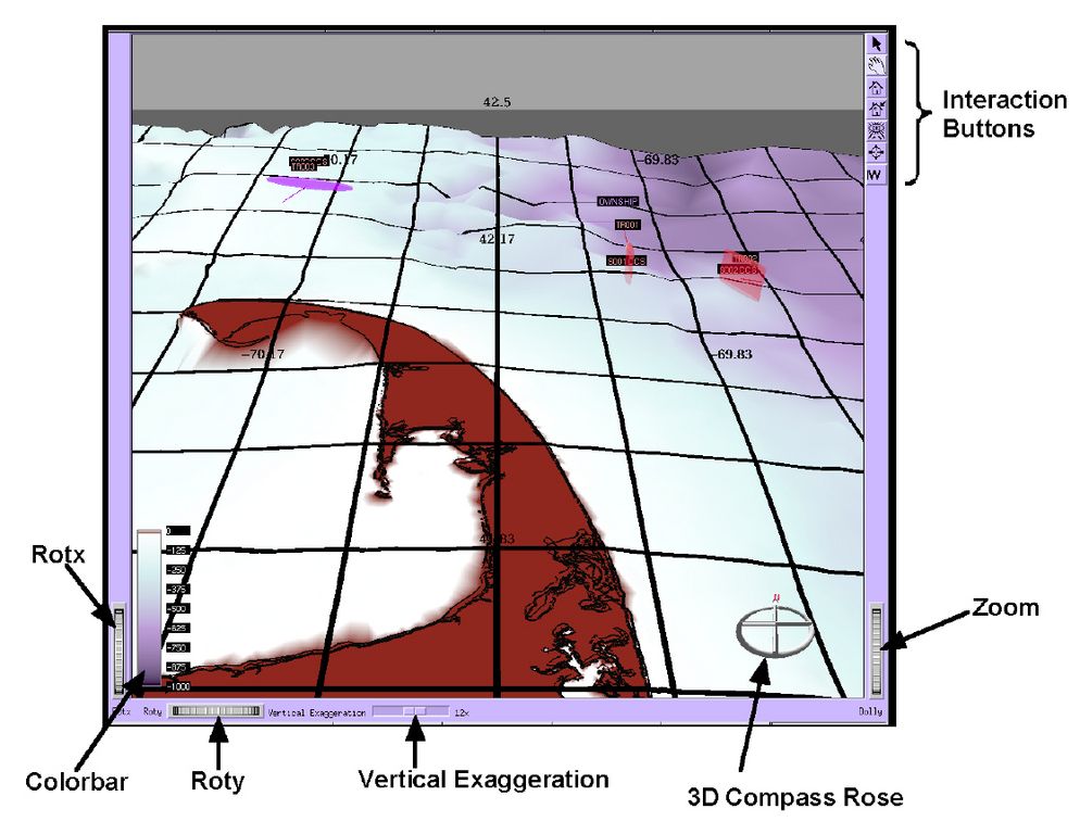 The lower-left corner of the 3-D display contains three scene interaction controls. The Rotx dolly rotates the scene about an imaginary x-axis running horizontally across the screen. The Roty dolly rotates the scene about an imaginary y-axis running vertically across the screen. The vertical exaggeration slider bar changes the depth ratio of the scene. This serves to exaggerate 3-D depth within the scene. To use any of these dolly wheels, simply place the mouse cursor over the dolly, depress and hold the left button while dragging the cursor in the desired direction. The lower-right corner of the 3-D display contains a zoom dolly. Zoom-in is limited to collision with the bottom, at which point zoom ceases.