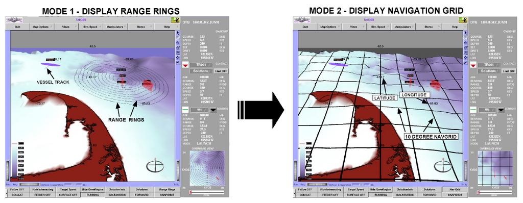 An essential component of any tactical or situational awareness display is precise knowledge of location on the earth. TALOSS supports navigational information using two methods. The first is a system of navigational grid markers that are ten degrees of latitude and longitude. Because distance is equal for all latitudes, this amounts to ten nautical miles for latitude. Because the distance between longitude lines varies with latitude, the number of nautical miles between longitude lines is dependent on latitude. For temperate latitudes, it is approximately ten nautical miles. Second, in addition to the lines of constant latitude/longitude, an alphanumeric value appears on the 3-D map indicating latitude and longitude. These values and the navigational grid lines are extracted from the Digital Nautical Chart database. The navigation grid toggles with the range ring display; however, the alphanumeric markers are always displayed. Figure 5 shows a view of the 3-D display with all navigational information enabled.