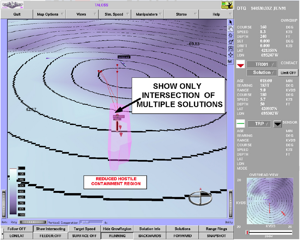 Containment regions can be grown and intersected to mimic a vessel's movement over time. Growth of the regions represents all possible locations the vessel could occupy within the containment volume when precise sensor contact on that vessel is lost. When a sensor update on the vessel is obtained, that updated information, in the form of new 3-D containment volume, can be intersected with the previously grown 3-D volume to extract a much-reduced common volume (see Figure 7). This common volume has the highest probability of containing the vessel of interest. The goal of a military combat system is to “localize” the threat containment volume rapidly, so an appropriate tactical response can be precipitated expeditiously. In other words, fight or flight.
