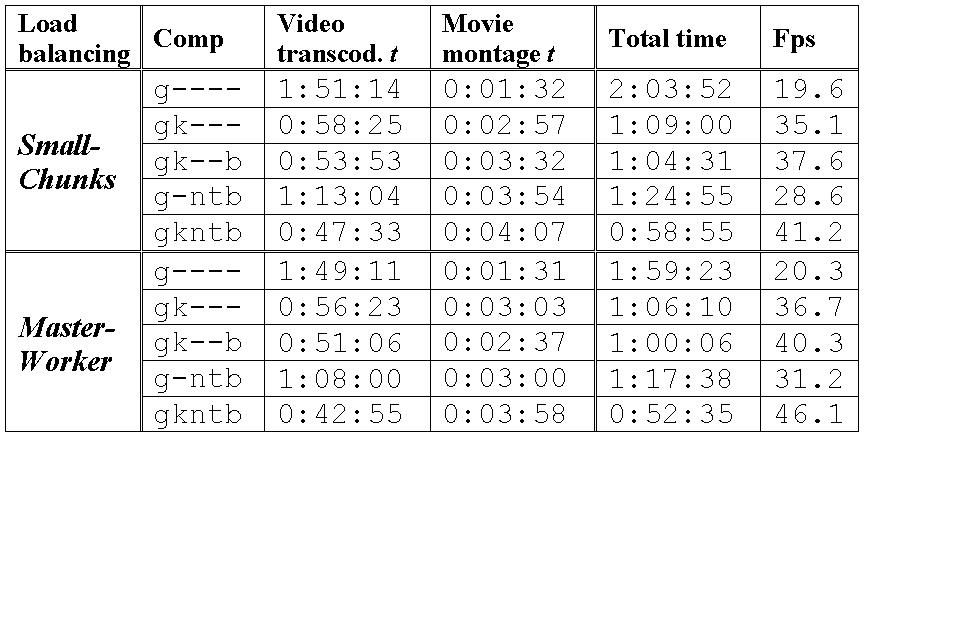 We used the two load balancing strategies, Small-Chunks and Master-Worker. The testing movie was All about My Mother, which has a length of 1 hour and 37 minutes and an original size of 2.94GB. The tuples in the comp column in Table 2 are the first letters of the names of the test bed computers, for example, g refers to gigabyte and t refers to titan. A - symbol indicates that the computer was not used in that particular test. Chunk size in Small-Chunks was set to 60MB. Video preprocessing time has not been included because it was negligible in all cases.