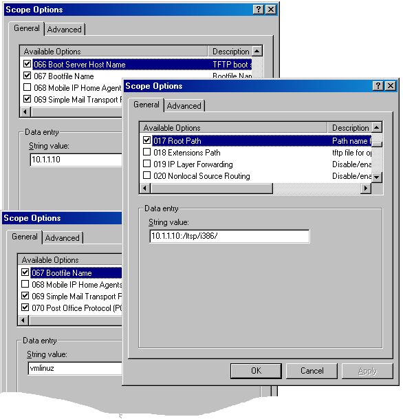Figure 1. The three scope entries needed on a Windows DHCP server. Notice that the root path has the trailing slash workaround.