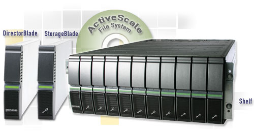 Employing an object-based architecture that manages data as large virtual objects, the ActiveScale Storage Cluster is comprised of the ActiveScale File System, StorageBlades and DirectorBlades, a 4U system shelf and an integrated gigabit Ethernet switch. The ActiveScale File System turns files into smart data objects and then dynamically distributes data activity across the StorageBlades. This design enables parallel data paths between servers and StorageBlades, eliminating performance and capacity bottlenecks. Application and user data is stored in the StorageBlades, and filesystem activity is coordinated by the DirectorBlades. DirectorBlades also virtualize data objects across the range of StorageBlades so the system can be viewed as a single namespace.