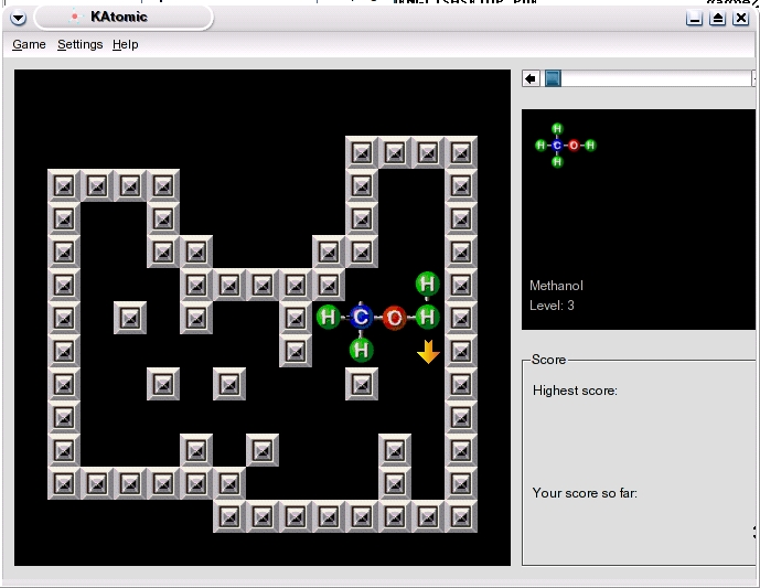 If you ever have played Sokoban, you should notice some similarities here. The premise of KAtomic is simple. Execution is somewhat more complex. You are given a molecule, displayed in the right-hand pane, with its component atoms scattered in a maze of sorts. Pressing the Tab key (or clicking the mouse) selects an atom that you then set in motion by pressing one of the cursor keys. Once in motion, the atom continues to move until it hits a barrier, either a wall or another atom. In this way, you create complexity from simplicity. It's also a fantastic way to eat up your free time.
