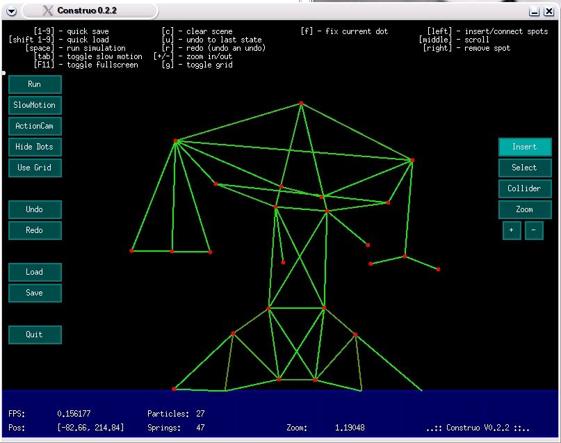 When the program starts for the first time, you are presented with a clean slate. At the top of the program window, you see some keyboard shortcuts. To the right and left are control buttons. If you abandon a design halfway when you quit, Construo returns you to that design the next time you play. If, like François, the idea of starting clean intimidates you, click the Load button and navigate to the Examples directory. There, you are rewarded with a number of prebuilt structures you can modify until you feel more confident to create from scratch.