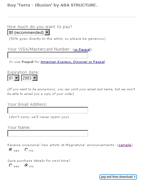 Several unusual features can be found in Magnatune's music-download purchasing process. Buyers determine how much they want to pay, we don't use a shopping cart, we support PayPal and anonymous Visa purchases are allowed.
