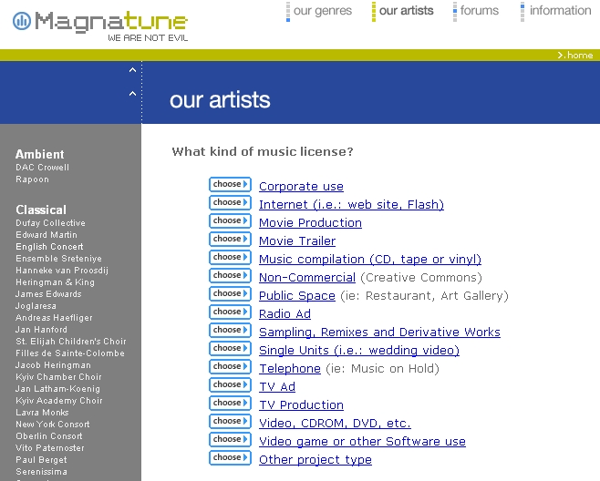 Clicking the License button next to any album brings up a page (see Figure 5) with the question “what kind of music license?” Sixteen different scenarios are displayed, such as Movie Use, Radio Advertising, Web Site, CD Compilations and even On-Hold Music for telephone systems. The connected page outlines the relevant variables for that scenario, and a price quote is given. The user enters the project details and then is sent to a Check Out page with a music license agreement, which is valid as soon as the fee is paid.