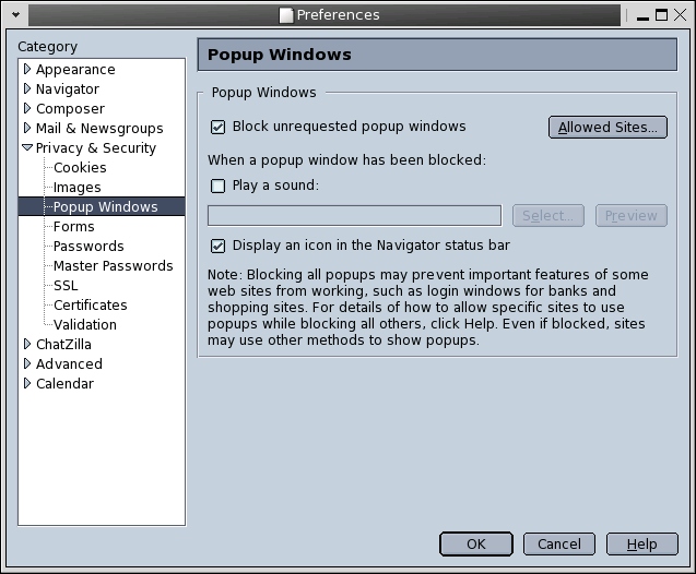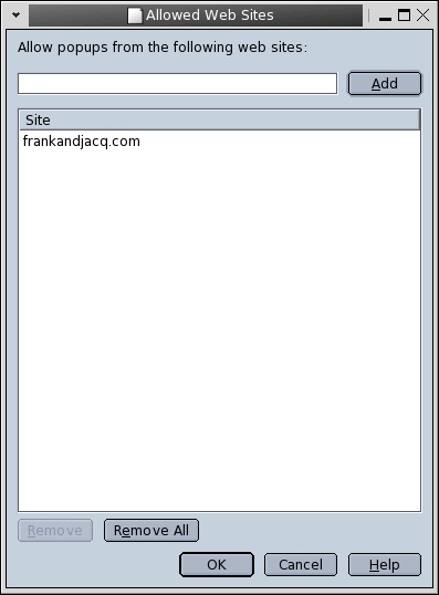 The first step is to set up Mozilla to block pop-up windows. The option to enable this feature can be found under Edit→Preferences→Privacy & Security→Popup Windows. You are greeted by the screen shown in Figure 1. Choosing the option to Block unrequested pop-up windows does exactly that. You can play a sound or display an icon when pop-ups are blocked if you so desire. There also is an option to allow pop-ups explicitly from certain sites. If you click on the button labeled Allowed Sites..., you are shown the screen in Figure 2. This feature is handy for sites that pop up external windows for things like showing progress for a long-running task. You can leave this list blank to start and add sites as you go.