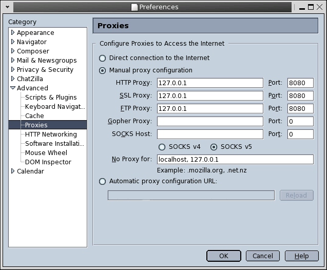 Now we're going to set up Mozilla to use Squid as a proxy server. To do this, go to Edit→Preferences→Advanced→Proxies. Choose the Manual proxy configuration and put in 127.0.0.1 for your HTTP Proxy and 8080 as the port. If you are running Squid on a port other than 8080, enter that value here. Put in the same values for your SSL Proxy. You should end up with something similar to what is shown in Figure 4.