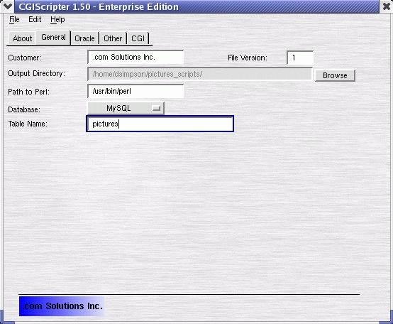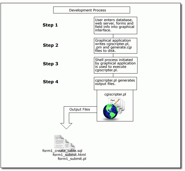 The CGIScripter graphical interface has been implemented in the Revolution development environment from Runtime Revolution Ltd. The graphical interface allows the user to enter/change information, load/save files and provides data validation on a field by field basis. The heavy lifting, however, is accomplished by a Perl program that reads configuration files written by the graphical interface and then generates the Perl, HTML, database table creation SQL and instructions files (see Figure 1).