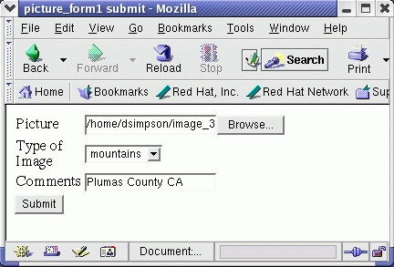 Now we're ready to use the Web application we have created. The first script we use is the Submit Form so we can input some data into the database. Use your browser to go to the HTML submit page, which has the URL http://10.1.0.25/picture_form1_submit1.html/ . You should notice that no Image Number field is listed on the submit form. This field is specified as an Auto-Enter Serial Number field; therefore it has been omitted from the form, because its value is supplied by the MySQL database. For the image field, select a GIF or JPEG image containing less than 100K bytes from your hard drive. Fill in the remaining fields as shown in Figure 12 and then press the Submit button.