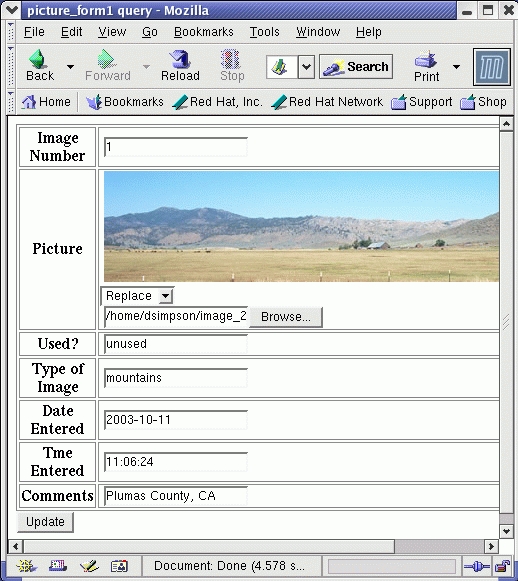 Now that we have some data stored in the pictures table, we can test the query and record display features of our new scripts. Use your browser to go to the HTML update page, http://10.1.0.25/picture_form1_update1.html/ . Select ocean from the Type menu to find all of the image records that contain ocean images. If the search results include more than 30 records, you can test the result set paging feature. Clicking on the image number for any record in the list displays the entire record, including the image uploaded into the database. The image stored within the database is displayed in the Web browser if it is a GIF or JPEG image. Any type of binary file, such as a StarOffice document, a PDF file or a binary executable file, may be inserted into a LongBLOB column within the MySQL database table. These other types of files, however, aren't displayed within the Web browser window. An image may be replaced within a record by selecting the Replace menu item and browsing to select the file to be uploaded, as shown in Figure 13.