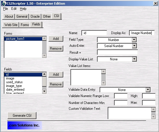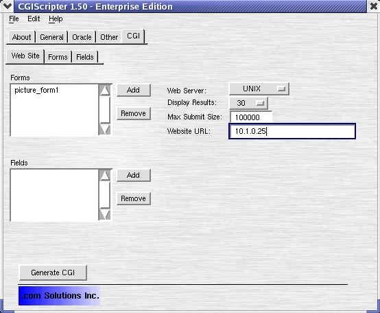 Click on the CGI tab and three more tabs become visible under the first group of folder tabs (see Figure 7). These three tabs enable you to enter parameters specific to the Web Site, each Web form and the fields located on each Web form. The Web Server menu defaults to UNIX, which we do not need to change, although code also can be generated for Windows IIS Web servers.