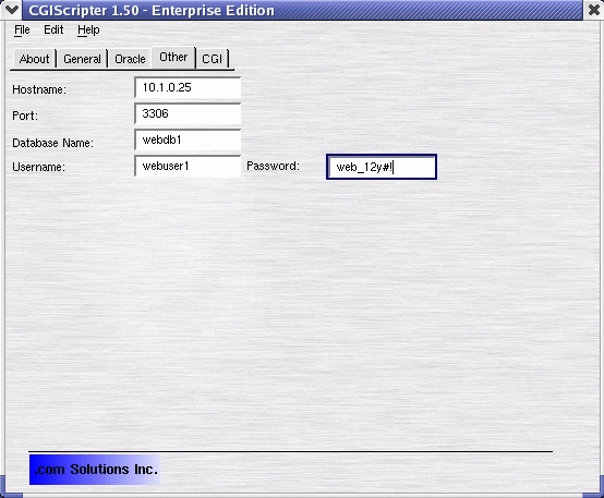 Four folder tabs appear across the top of the CGIScripter window; we concentrate on updating them first. Update the default contents of each field on the General and Other folder tabs as shown in Figures 5 and 6. We don't need to update any fields on the Oracle folder tab.