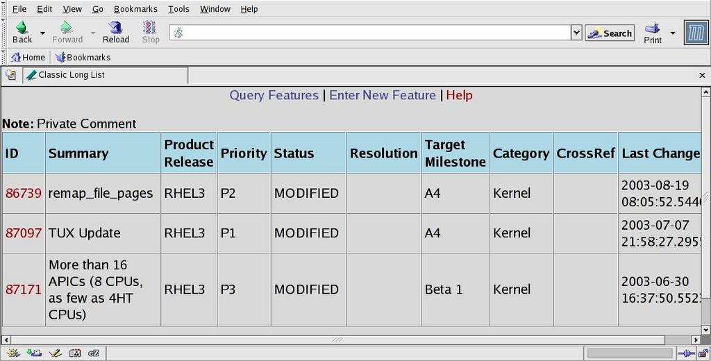For Enterprise Linux v. 3, the initial set of requested features was about 500 items. Each of these was entered into our feature-tracking tool called Featurezilla, which actually is a derivative of the Bugzilla bug-tracking tool. Figure 1 shows several items in Featurezilla. To show that the jabs go both ways, one partner has a business manager whose name is Paul, name changed to protect the innocent. He manages a list as a text file, but back at his company, the list is referred to as Paulzilla.