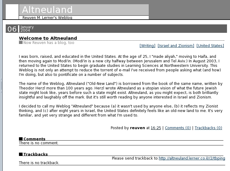 Moreover, some of the nicer Weblog features, such as comments and trackback, can be tricky to implement. They aren't necessarily hard to work with, per se, but given that it seems 100,000 different mechanisms for commenting on Weblog postings already are out there, I would like to avoid creating number 100,001.