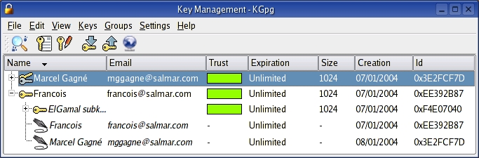 /home/marcel/.gnupg/pubring.gpg ------------------------------- pub 1024D/3E2FCF7D 2004-01-07 Marcel Gagné ↪(Writer and Free Thinker at Large) <mggagne@salmar.com> sub 1024g/B24717BE 2004-01-07 pub 1024D/EE392B87 2004-01-07 Francois ↪(I am but a humble waiter) <francois@salmar.com> sub 1024g/F4E07040 2004-01-07
