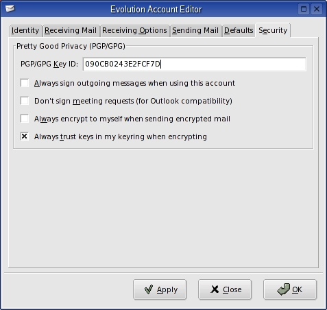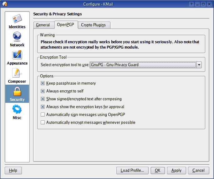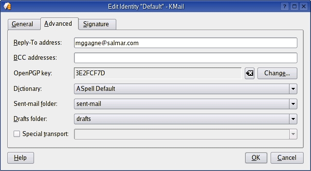 When finished, click OK to close the Edit Identity window, and click OK again to close the Configure KMail window. In order to reload the keys into KMail properly, you may have to shut down KMail and restart it.