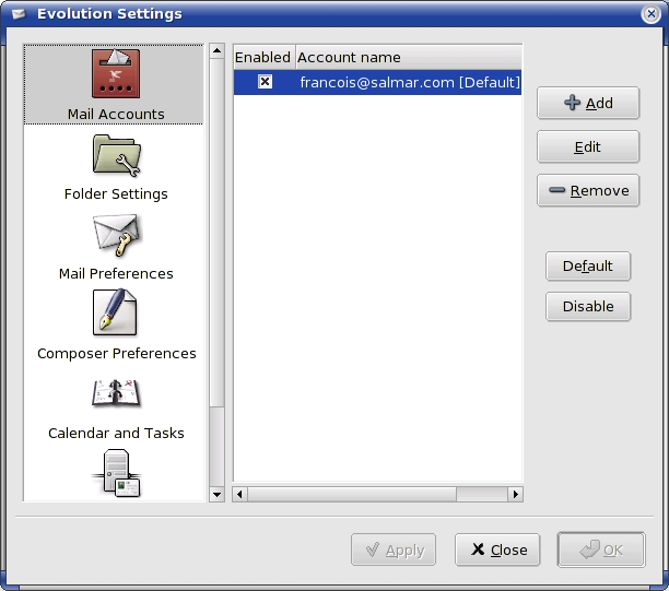 With Evolution open, click on your inbox. Now, click Tools on the menubar and select Settings. You now are looking at the Evolution Settings window (Figure 5). If the Mail Accounts icon in the left-hand sidebar isn't selected, click to select it now. Most people have one main account. If you have more than one, select the one you want to use with encryption and click the Edit button to the right. The Account dialog appears with several tabs along the top. The one you are interested in is labeled Security. Look for a field labeled PGP/GPG Key ID and enter your key ID there. Click OK to close that dialog, then OK again to get out of the Evolution Settings window.