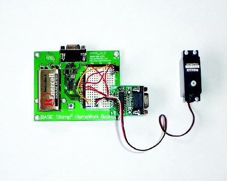 I wired up the Stamp relatively quickly over a few days of experimenting. The attached breadboard is a great feature of the Homework Board. I was able to rewire and test circuits quickly without having to solder and desolder. Figure 2 shows the completed schematic. Figure 3 is a picture of the wired-up Homework Board.