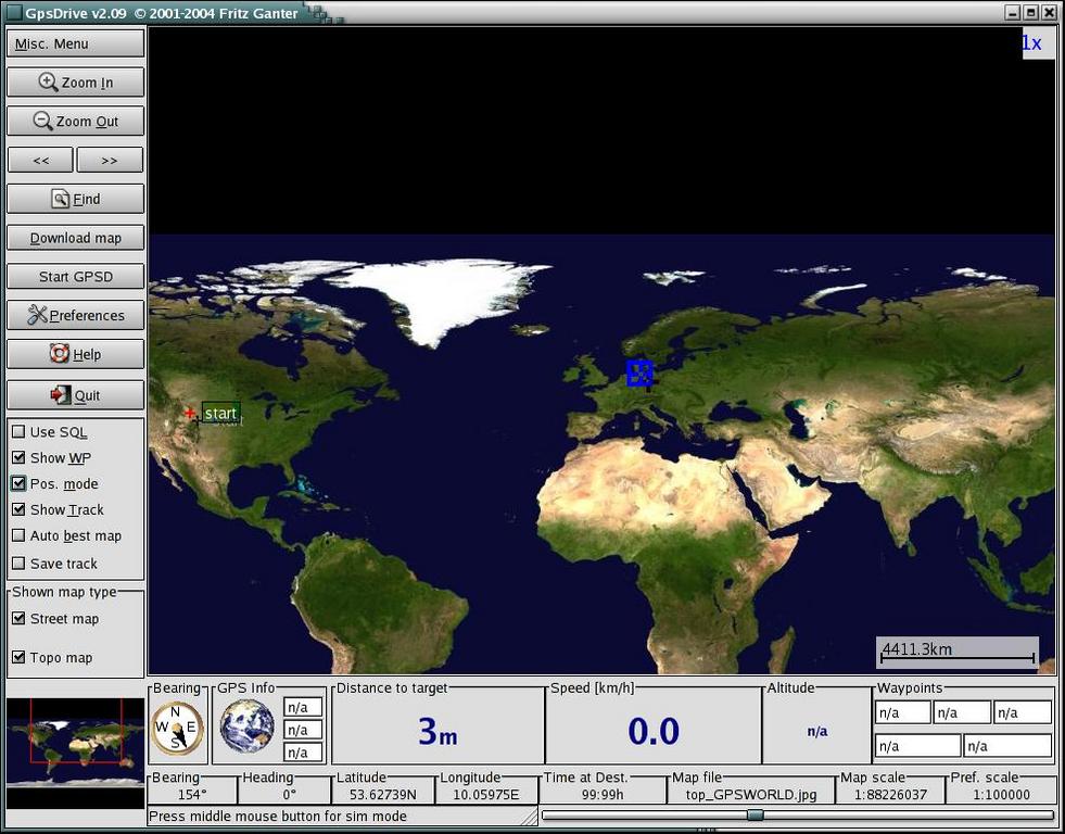 In simulation mode, GpsDrive generates a path from a starting point to one or more waypoints. To enter simulation mode, bring up Preferences, go to the first settings tab and check Simulation. This is a fun mode, as you get to watch an imaginary vehicle move at high speeds across the countryside.