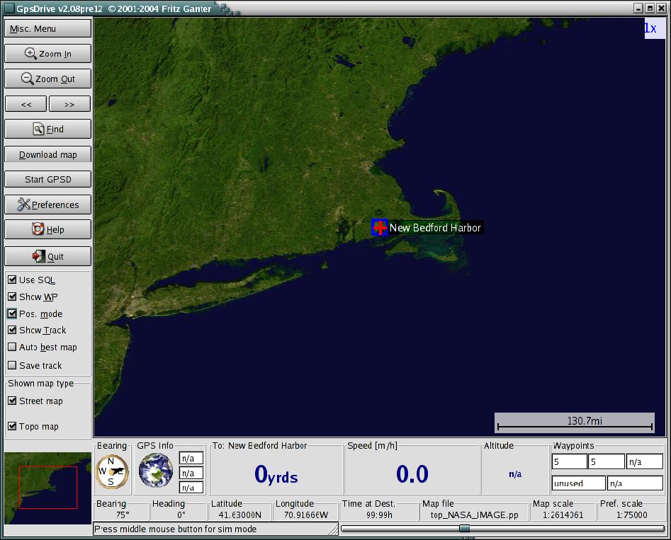 Once you close the nag box, you should see an image in the map section of the GpsDrive window. This is a placeholder until you get a map for yourself. The first thing to do is turn off simulation mode in the Preferences menu. While you are there, if you want statute or nautical miles, select that option.