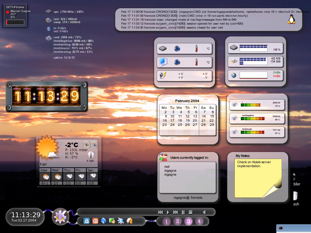 You should find a great number of SuperKaramba themes available. Some are Kicker panel replacements, like Sven Johannsen's Glass Machine (pictured on the bottom of Figure 1). Aside from giving you slick access to your kicker functions, the Glass Machine also makes all your XMMS controls handy. A little music helps sysadmins get their work done, and several jukebox and multimedia toys are available to choose from on the site.