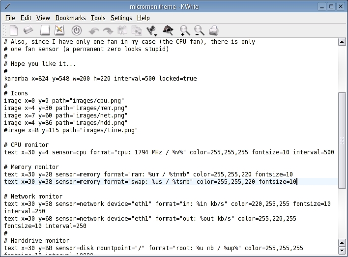 Launching subsequent themes doesn't require you to re-run superkaramba. Instead, right-click on a running theme and choose Open new theme. Right-clicking on a running theme provides several menu options, including the ability to edit a currently running theme or its configuration file (Figure 5). Theme files generally are easy to read and lend themselves to simple edits. For instance, I modified the Micromon theme (Figure 1) to display my own disk partitions instead of the ones defined by the author. I also increased the font size to make it easier to read.