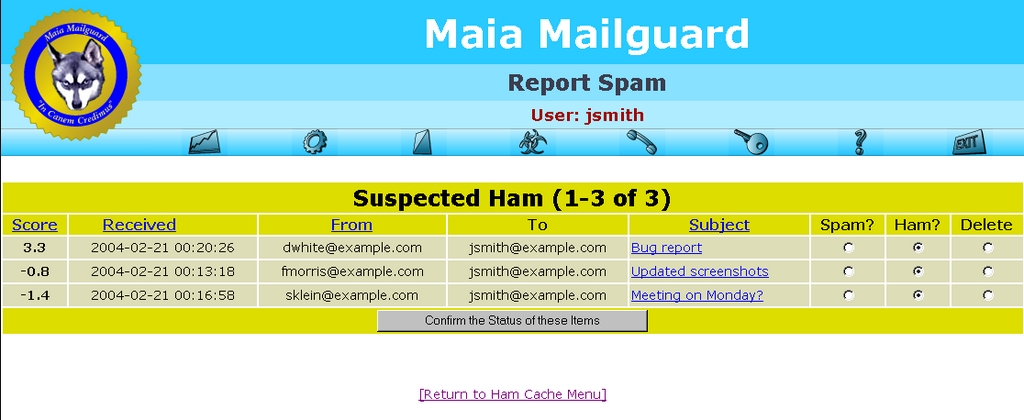 The quarantine and ham cache also provide a means for you to confirm the status of the mail you've received. This not only helps train the Bayesian learning system, it also makes it possible to report spam properly, because it's been confirmed by a human being.