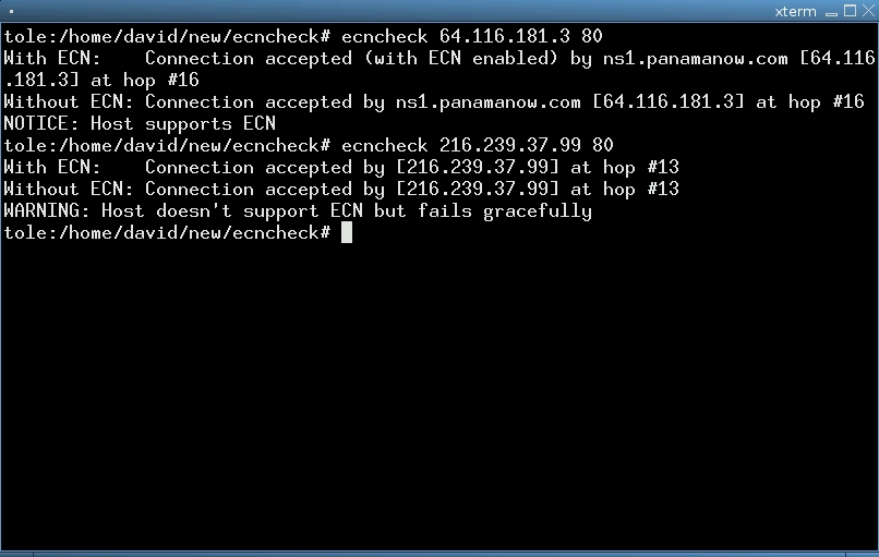 Have you ever found that you can't get to a particular Web site from a Linux system, but other systems have no problem? Then, you later find out ECN (explicit congestion notification) was turned on in the Linux system and that's what caused the problem? Would you like to be able to check a site for compliance with the RFCs or simply find out if they support ECN? ecncheck can do it for you. Requires: libpthread, glibc and raw socket access.