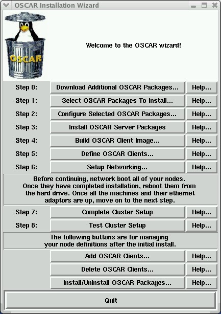 Figure 1. The OSCAR installation main menu. In less than ten steps the cluster is ready to compute!