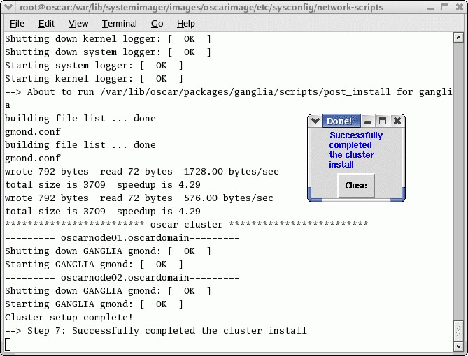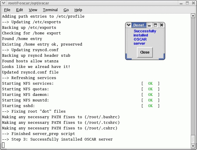 The next stage is to Install OSCAR Server Packages. This is non-interactive and basically sets up packages for use on the server. When it is done, you are alerted by a pop-up window.