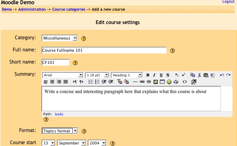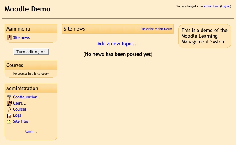 To add a new course, while logged in as the administrator, follow the Courses link in the Administrator block on the main page of the Moodle site and choose the button to add a new course. Courses are classified into categories and each course has to belong to a category. Miscellaneous is the default category. You can add, delete or hide categories as needed.