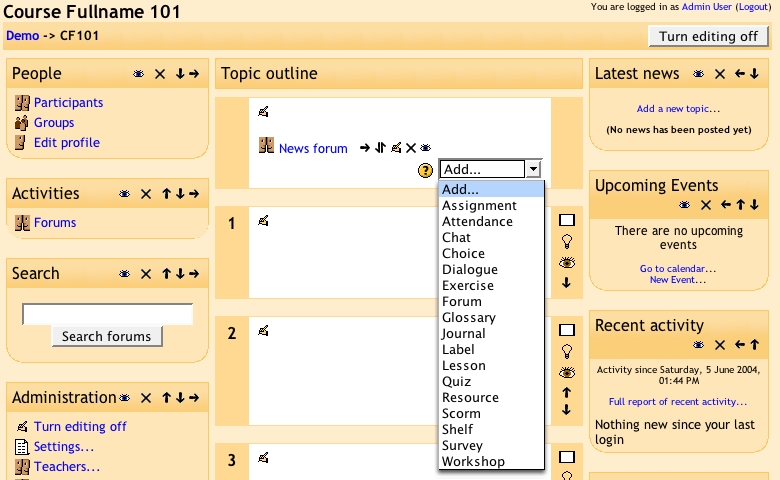 After you create the course, you are taken to the main page of the newly created course. Choose the Turn editing on button at the top right corner of the page. With the editing turned on, tiny icons appear all over the page. These icons allow you to reposition blocks of content on the page as well as add, edit or delete resources and activities in the course (See Figure 3).