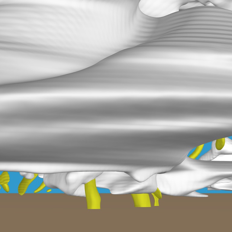 Figure 2. An example of multiple isosurfaces, focusing on a region of the supercell called the wall cloud. The yellow isosurfaces in the foreground, which are located below the wall cloud, represent where tornado-like swirling motion is occurring.