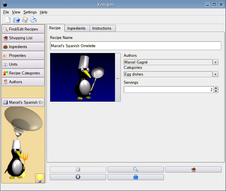 Looking for a way to get my Linux box to help out in the kitchen led me to Krecipes (see the on-line Resources section). Unai Garro, Jason Kivlighn and Bosselut Cyril have been putting together a nice open-source package that makes creating and maintaining your own list of favorite recipes a breeze. Krecipes lets you create and edit your own recipes as well as import them from popular exchange formats, including RecipeML, MasterCook, Meal-Master and others. It saves its own recipes in KreML (Krecipes XML format). You also can maintain categories, track calories (fiber, fat and so on), create shopping lists based on selected meals and more.