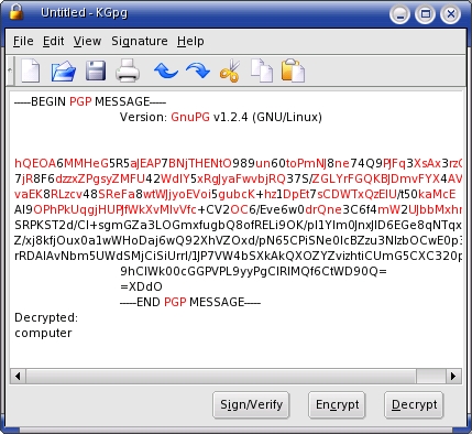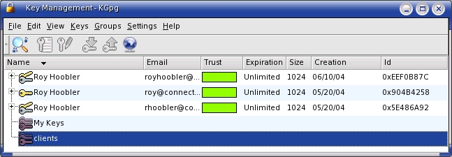 Another handy tool in KGPG is the ability to create groups of keys. I could have an Administrative group that contains three or four keys. When sending a message, I can select that group and send it out. Later, if a recipient forwards the message to another person in the group, it already will be ready to read.