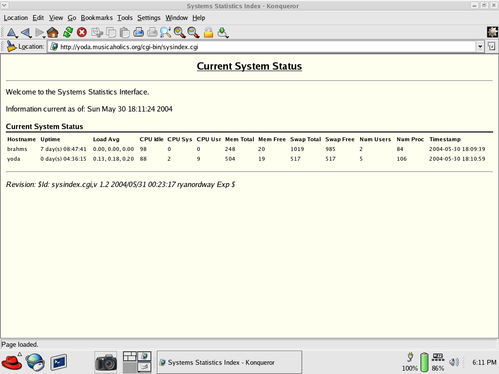 Extracting data from the database for reporting can be as easy as doing a SELECT on the current database table or as complex as merging the current data with historical data from the archive table. You even can use the numerical data points to generate graphs. A sample reporting interface is included with the main distribution in the examples/web directory. The sysindex.cgi program is a Perl CGI application that uses DBI to talk with MySQL, grab all rows from the current data table and output them in a simple HTML table, as shown in Figure 2.