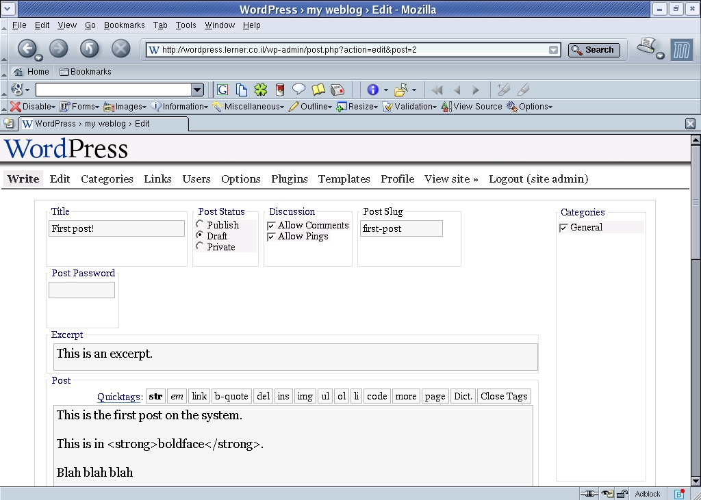 Like most software with good user interfaces, WordPress includes many small features that add up to a pleasant experience. For example, it automatically creates en and em dashes when you use two or three hyphens. It allows you to classify postings as drafts (the default), private or public, which means that you can start working on a Weblog entry, go to lunch and then return to work on it.