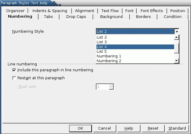 Paragraph and line numbering can be added from the Numbering tab. Paragraph numbering associates a numbering style with the paragraph style. Line numbering is set in Tools -> Line numbering.