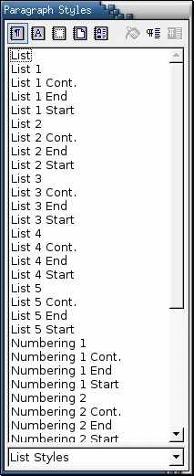 This division of lists and paragraphs has several advantages. To start with, it reduces confusion by separating the two different functions of setting up lists and formatting paragraphs. More than one MS Word user has complained of not knowing which they were editing, but with Ooo Writer, this confusion is eliminated. Equally as important, by separating lists and paragraphs, Writer not only gains the interface space for giving lists a complete set of options, it also avoids burying the options deep in the menu structure. Moreover, because lists are separate, they can be used by more than one paragraph style, which saves users time. For instance, if you want two paragraph styles to use Roman numerals, you need to set up the numbering only once. Changing a paragraph's numbering style is equally easy. This is the economy of effort that all styles are intended to provide.